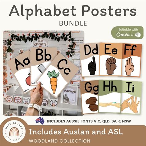 Woodland Alphabet Posters Bundle, ASL Auslan Sign Language Neutral ABC Wall Cards, Cursive Letter Rustic Display, Editable Classroom Decor