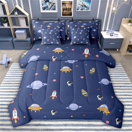 Jejeloiu Space Astronaut Planet 7-Piece Bedding Comforter Set,Cartoon Rocket Aircraft King Bedding Sets For Teens Reversible