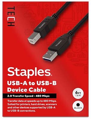Staples TECH 6 ft. USB-A To USB-B 2.0 Cable, Male To Male, Black (ST62438) | Quill