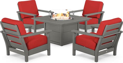 POLYWOOD EDGE Sectional Lounge And Fire Pit Set In White/Cabana Stripe Grey Mist - Outdoor Furniture